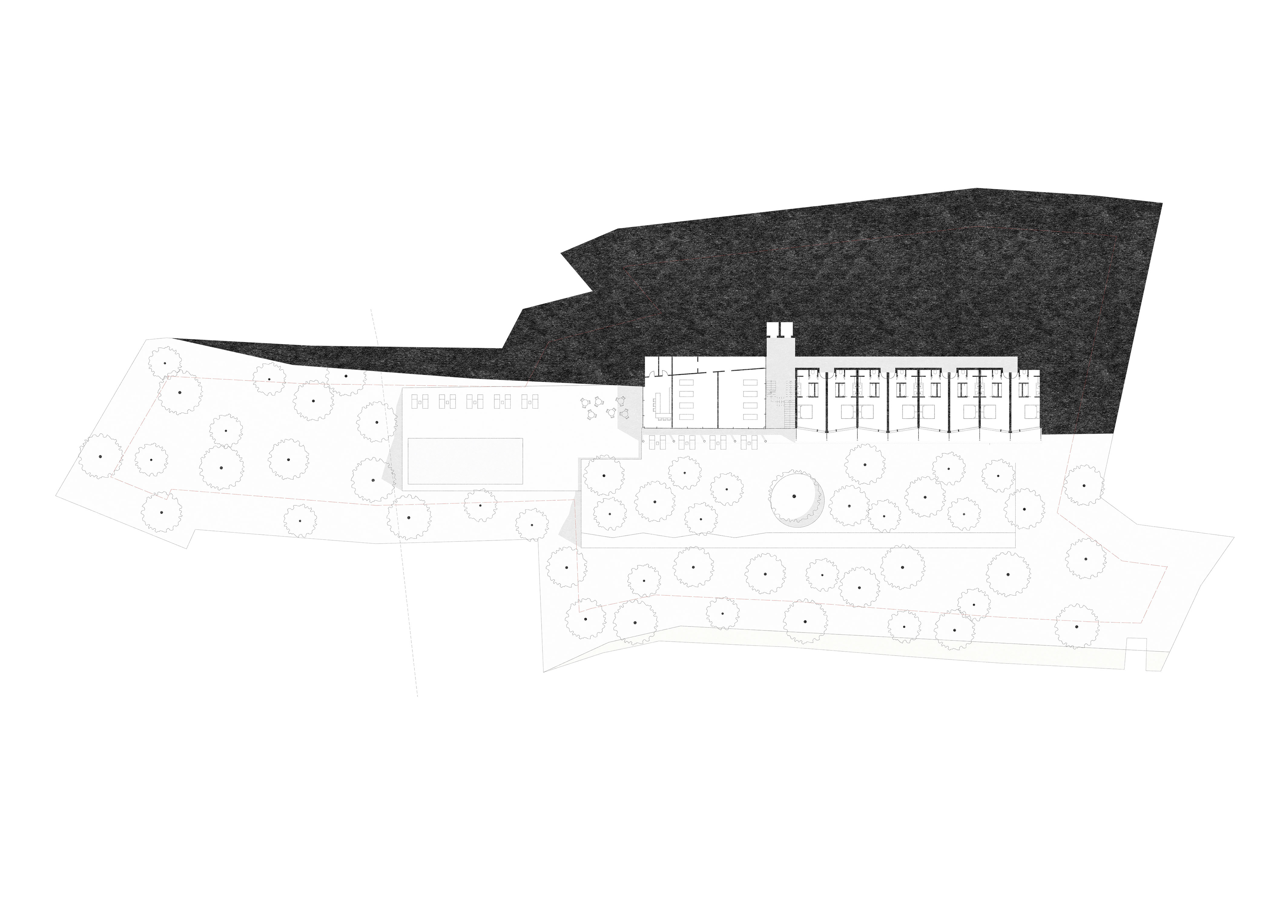 Die Setzung und Körnigkeit der neuen Baukörper ist aus dieser Beobachtung heraus entstanden und knüpft an die ortstypischen Freiraumqualitäten an. Das Zentrum des Ensembles bildet die Fabrikantenvilla. Im nördlichen Teil des Grundstücks wird das Volumen der bestehenden Scheune als Wohnhaus wieder aufgebaut und durch einen abgesetzten Anbau im Osten erweitert.